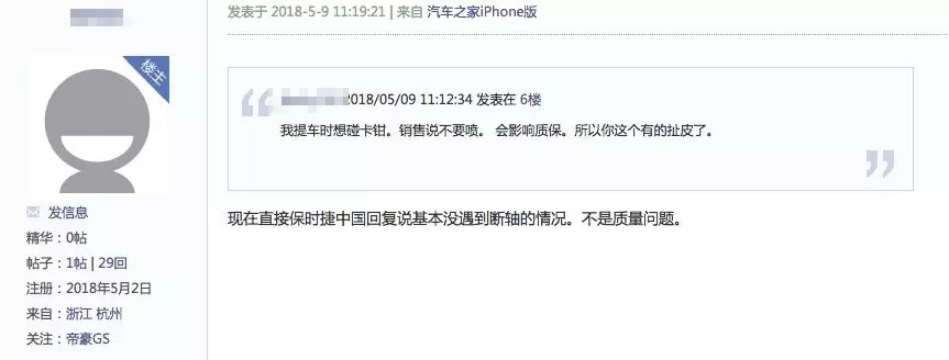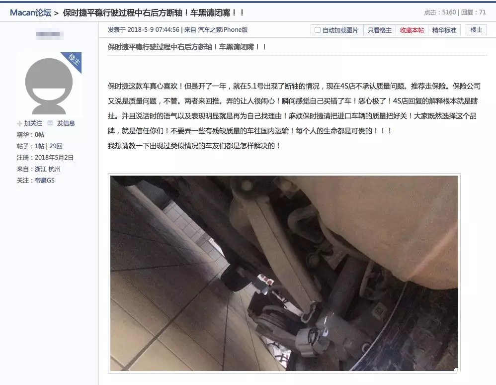 事情发生了以后,网友找到了保时捷厂家和4S店,而得到的回复是:不是质量问题。网友讲述,“现在直接保时捷中国回复说基本没遇到断轴的情况,不是质量问题。”而4S店同样宣称不是质量问题,推荐网友走保险,但保险公司却说车辆断轴是质量问题,没法做赔偿,这让网友很无奈,感觉自己买错了车。