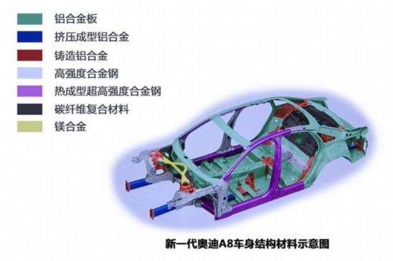 相比现款车型,新一代奥迪A8车身材料种类得到了增加,达到4种。首次应用了碳纤维复合材料,向奥迪R8车型看齐。