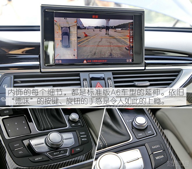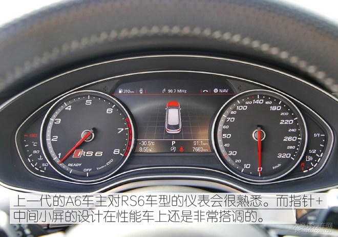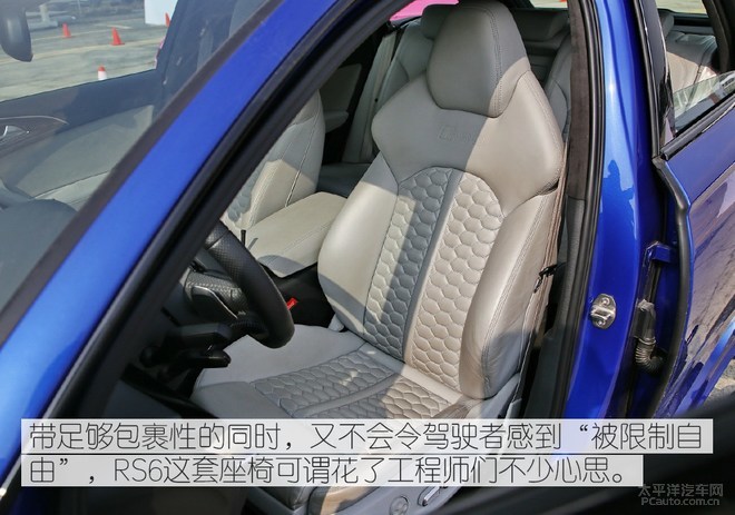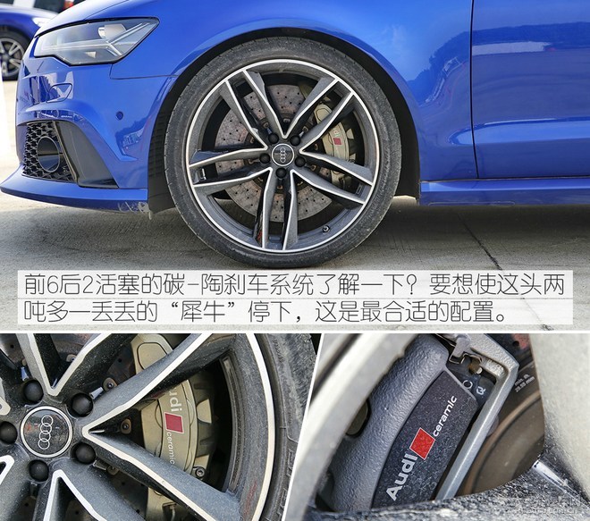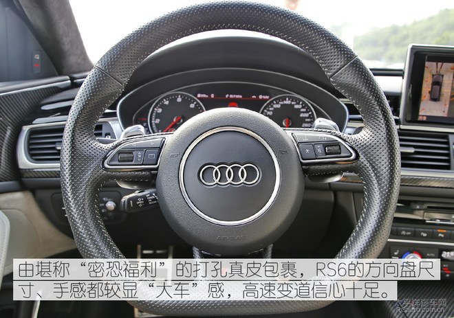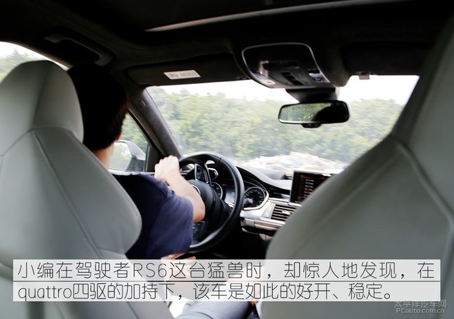 猝不及防般到来的加速G值令小编的头不由自主地向后甩去,被RS6的一体式桶椅完美地接住了。嗯,RS6的头枕还是挺舒服的。然而,在560PS的马力的一阵嘶吼过后,一个快速变线的弯道就出现在了小编眼前:一脚刹车下去,前6后2卡钳的碳陶刹车系统开始全力工作,淡定地“吸收”过多的动能,帮助小编“滑”过了那个弯道。