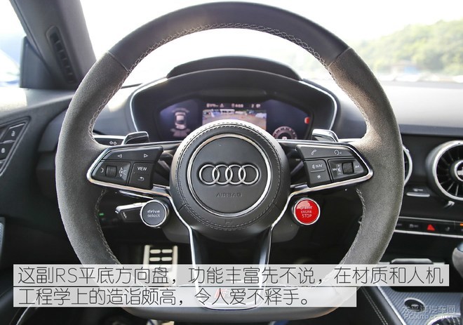 但在初/中段加速时,当这台2.5L排量的5缸涡轮引擎终于爆发出所有的400PS马力之时,7速DSG变速箱+横置版的quattro四驱系统也十分“敬业”地将动力毫无保留地输送到四个车轮上,TT RS就如初中力学实验那“被挂上砝码”的小车似的一往直前,直到下个弯道。