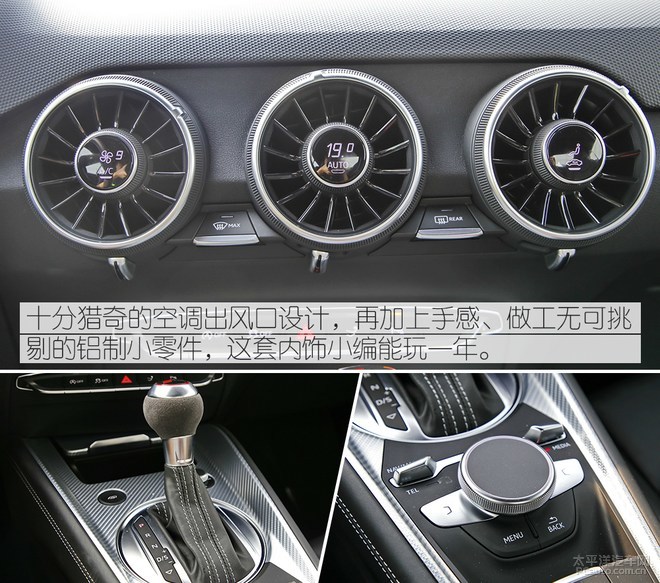 而中控方面,得益于更新的MQB平台。TT RS的内饰科技感胜过了RS6 Avant车型:随处可见的铝合金拉丝面板、类似于飞机涡轮引擎圆形出风口上的小型屏幕,乃至做工精细到“能玩一年”的MMI系统旋钮,无不是奥迪“秀肌肉”的体现。
