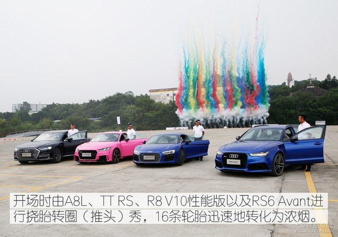 活动开始后,先是4辆四驱车型齐齐上场摆出阵列。正当大家都在期望奥迪能为我们奉献出一场漂移的盛宴时,略显尴尬的事情发生了:上至R8,下至TT RS,均只在全油门的状态下推头…再推头,漂移嘛,不存在的。