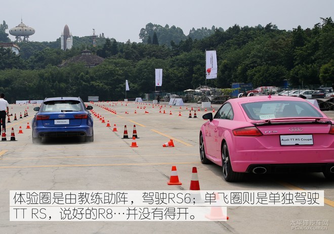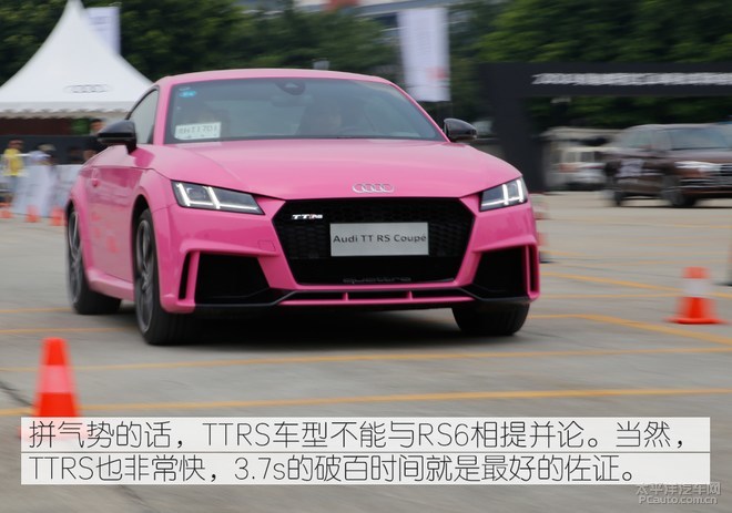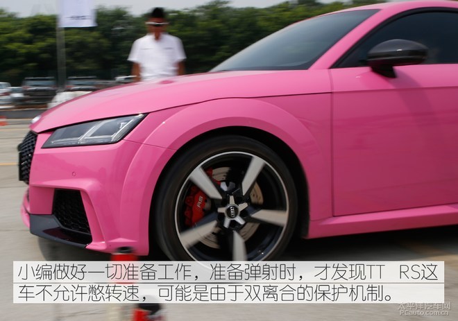 完成练习圈后,作为MQB平台上最凶狠的角色,这辆骚粉色的TT RS车型将迎接小编的驾驭。还是惯例,调整好所有的设置后,双脚踩住了两个踏板……发现或许是由于双离合变速箱保护程序的原因,TT RS拒绝了小编的憋转速请求:只要踩着刹车,油门无论怎样踩,转速最高只能达到1500rpm。这就造成了TT RS的初始加速度逊于装备AT变速箱的“大哥”RS6车型。