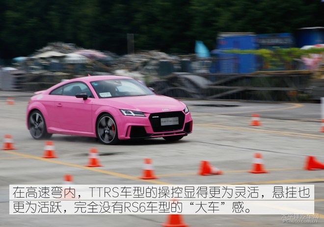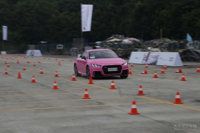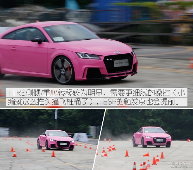 进入高速弯道,TT RS的底盘与动力形成了一个较为“皮”的搭配,能实时响应来自方向盘和油门踏板大部分的指令,驾驶乐趣相比RS6车型来得更为直接、充盈。但有一点值得注意的是,这充盈的驾驶感并不意味着TT RS的底盘极限特别高:在小编进入低速弯时,速度过高,底盘的动态在很短的时间内迅速从中性转向变成了严重的推头(还撞飞了几个桩桶,幸好未造成任何损失),且在油门开度已经较小的情况下的改出仍略显吃力。小编认为,TT RS的五缸引擎或是诱因之一:其本体+涡轮+冷却系统的质量较大,且集中在车头,搭配TT车系本身的配重特性,就造成了底盘极限来临后,持续突破了前轮的抓地力而导致推头较为严重的情况。
