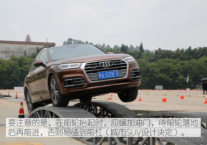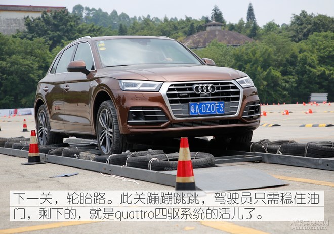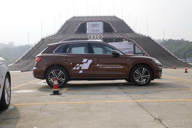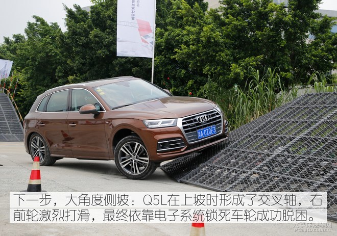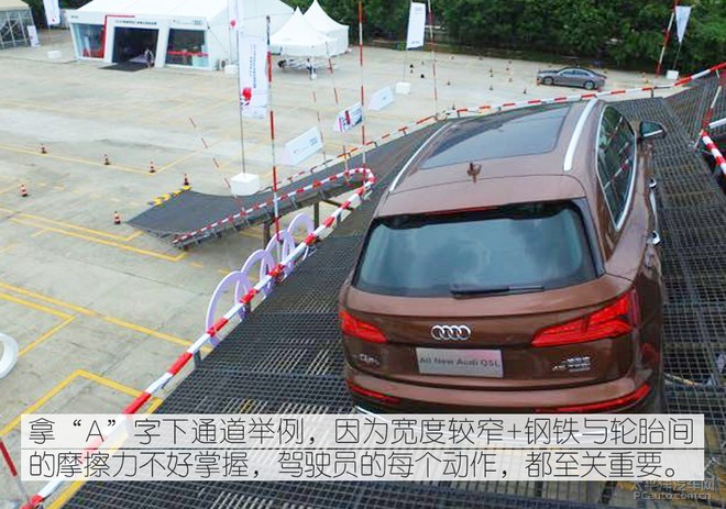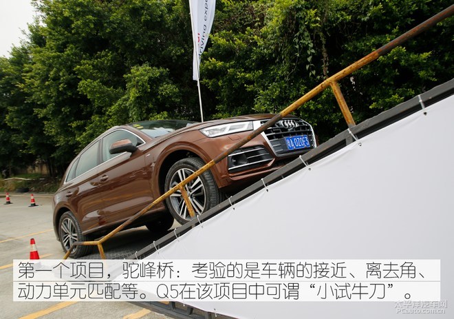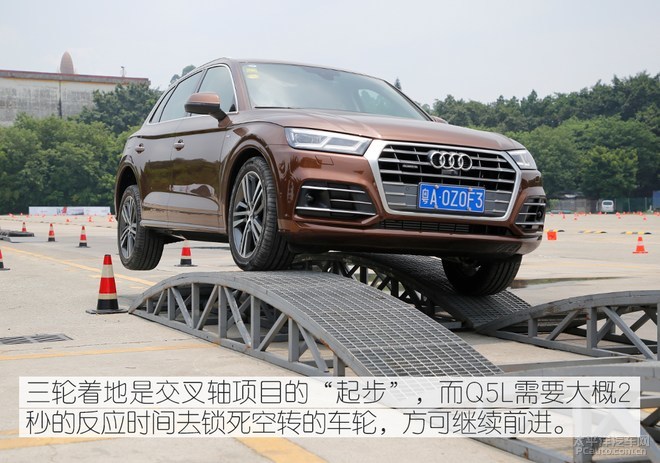 众所周知,Q5L的quattro四驱系统相比上一代的Q5车型有所“缩水”。然而,奥迪似乎很有信心,在现场为Q5L准备一一大堆的越野“玩具”,分别是驼峰桥、侧坡、轮胎路面以及堪称城市SUV四驱系统“验金石”的交叉轴。