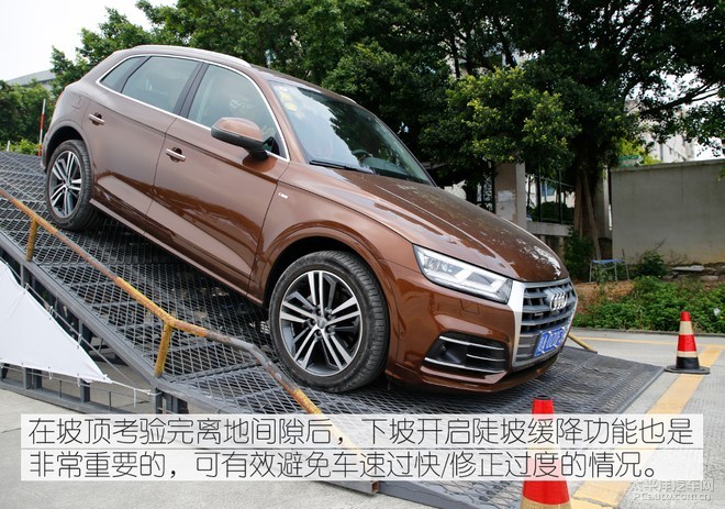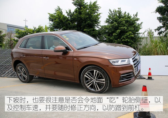 第一个项目,就是相对最简单的爬坡/下坡了,小编进行这项项目时,教练千叮万嘱要在上坡时缓加油门,以保持动力、避免半坡起步。小编认为,换装了7速双离合的新一代Q5L,半坡起步的能力相比上代8AT变速箱的Q5车型是有所降低的。而下坡时,可开启车辆的陡坡缓降系统以维持2-3km/h的车速,并维持好方向,Q5L就能稳稳当当地下坡了。