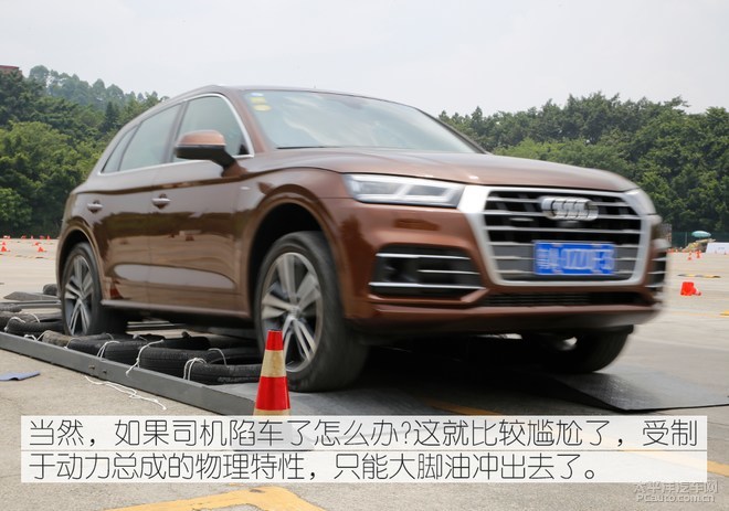 最后,在较深的油门开度的支撑下,最终电子系统还是锁死了打滑的车轮,堪称暴力地冲了出去(跟轮胎路的套路相同)。小编认为,在冲出去之后,面对下一个交叉轴,驾驶员还是应该注意控制刹车踏板,以避免撞到前保险杠。总而言之,Q5L总体的越野性能仍对得起其城市SUV的定位。