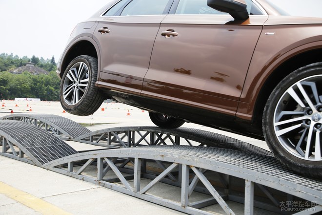 而到了这看似简单,实则暗藏玄机的大角度侧倾项目,小编Q5L在上台架时角度较大,形成了仅左前/右后轮胎着地的交叉轴情况,对quattro ultra四驱系统的限滑能力提出了很大的考验。最终,Q5L以三秒钟(其实现场看觉得时间还是有些长的)的右前轮打滑-锁死过程,还是蹦跶着上去了。下来也是同理,只需控制好接近角以避免胎壁与路面过度接触就可以了,从三轮着地到四轮,整个过程也是非常柔和。对于之后的几个项目可谓小菜一碟了。