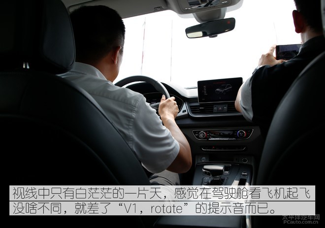 第一步,开始爬坡。小编已经看不到任何坡本身的路面情况了,窗外茫茫一片白。如果车机里再传出“V1, rotate”指示的话,这辆Q5L在小编的认知里,就是一架正在起飞的飞机了。