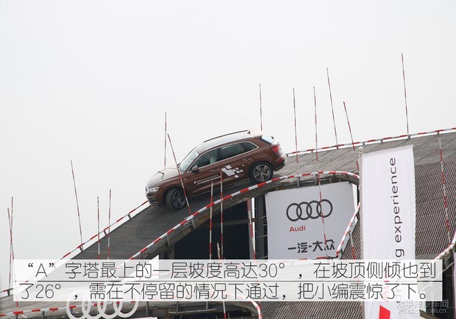 对于刚才还嫌没玩够的小编来说,还有个更刺激的“挑战大A”的项目体验:那最高达15米的钢制斜坡在等待着Q5l去“征服”:科目包括上陡坡(30°)-转弯(侧倾角高达26°)-以及最后的“安全落地”。