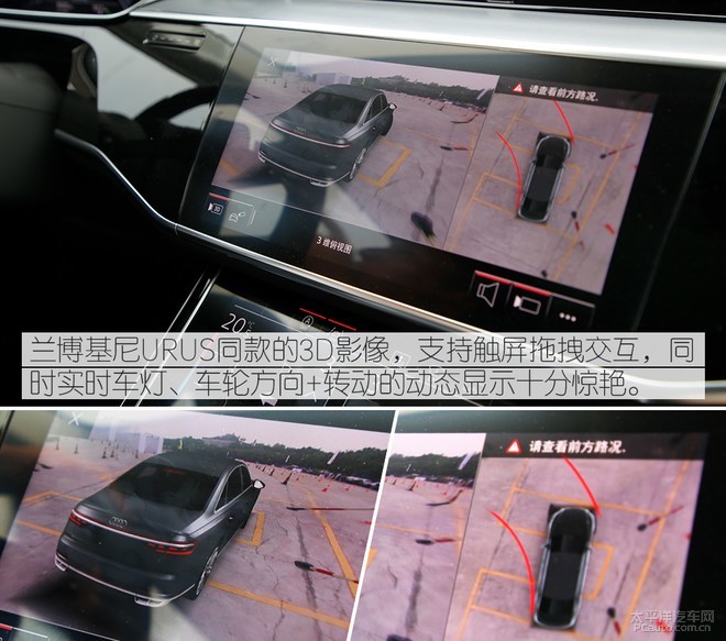 体验过兰博基尼URUS的车友们,对奥迪这套随动的3D环视影响系统必定感到熟悉:该系统通过多方位的探头,生成了车辆周边的整个3D画面(可触屏拖动切换视角,跟手机观看3D照片同理),而且显示素质十分精致;更有惊艳的是,里面的A8L的3D模型还具备实时灯光显示、车轮转向角度显示(包含4轮转向)以及车轮的实时运动效果。