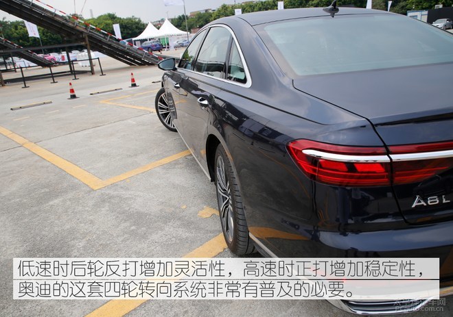 这套奥迪A8L引以为傲的4轮转向系统,令5米多长的A8L车型,竟能在一辆A级车刚刚好能掉头的空间下,完成优美的掉头。实现这一点,是四轮转向系统的功劳:低速下,四轮转向系统会指挥后轮与前轮打相反的方向(有最大限制角度,高速下则为同角度),将整车的虚拟转向圆心更加靠近车身(高速下是远离车身),达成更敏捷的操控(增加高速行驶稳定性),与叉车后轮的转向设计可谓“异曲同工”。