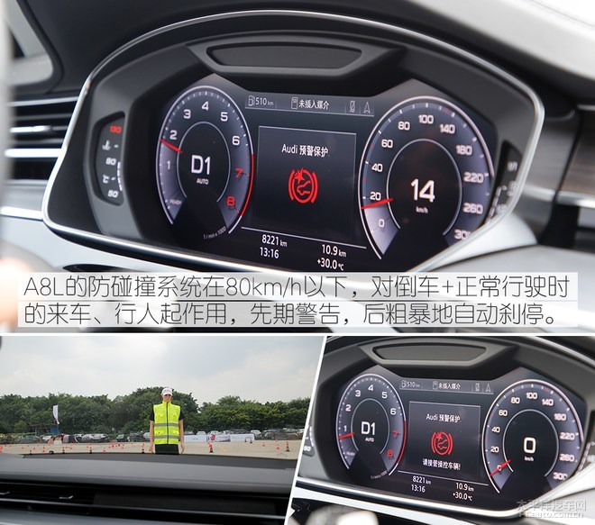 而最后体验的A8L防碰撞预警保护系统,对倒车时的快速来车、正常行进时的静止行人可避免碰撞:当系统检测到有碰撞风险时,会闪烁仪表盘、播放急促的碰撞预警声音以提醒驾驶员注意;而如果驾驶员分心乃至失去行为能力不能做出有效规避反应时,系统将在最后阶段(大概14km/h)“生猛”地将车刹停,并在驾驶员重新接管车辆前保持静止。