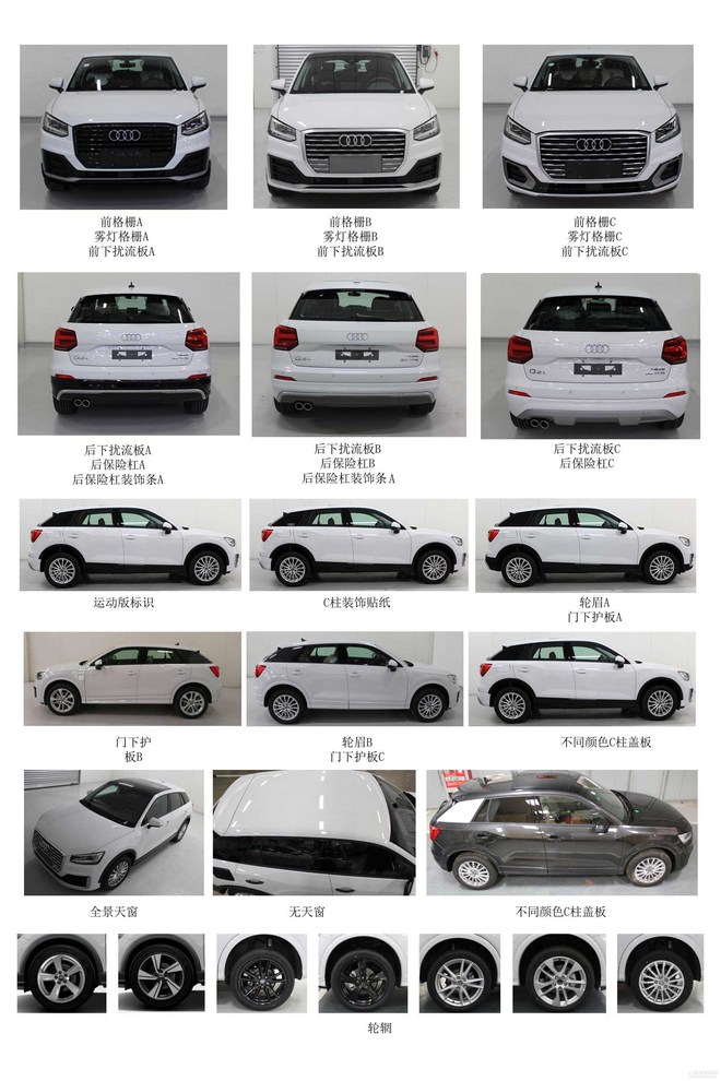 车身尺寸方面,新车的长宽高分别为4229(选装不同保险杠为4236)/1785/1548mm,轴距为2628mm。配置方面,全新Q2L将标配渐进式转向系统(可变转向比)、自适应巡航、7英寸升降式显示屏(高配车型为8.3英寸导航系统)、8扬声器音响(中高配车型配备原厂10扬声器音响和B&O品牌14扬声器音响)等配置。申报图上显示新车拥有7种不同样式的轮毂可供选择。