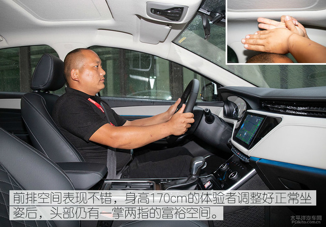 空间表现在同级别里处于主流偏上的位置,体验者身高170cm,坐进前排后头部空间还是比较富裕的,不过方向盘只支持上下调节,如果支持四向调节就更好了。