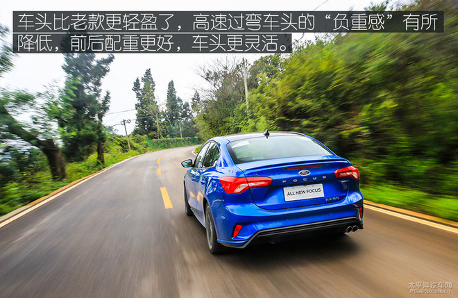 弯道中,全新福克斯的车头灵敏性较现款要更好一些。现款车型由于车头偏重,在弯道中会时常觉得头重脚轻。新款福克斯在这方面改变很明显,一方面是悬挂经过重新调校,另一方面,或许也是三缸发动机的重量更轻,这也使得前后配重比以前更好,弯道中带来了更好的平衡感。