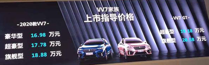 在本届成都车展上,WEY VV7家族完成全球首秀。其中2020款VV7正式上市,提供三款车型,售价区间为16.98万元至18.88万元;VV7 GT同步上市,提供两款车型,售价区间为19.18万元至20.58万元。