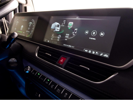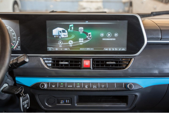 东风凯普特e星的中控台创新性地选用了双12.3英寸联屏,在豪华品牌轿车才出现的配置出现在一辆新能源轻卡车型上,还是足够令人惊叹的。相比传统的机械仪表,全液晶仪表的显示效果和信息丰富程度不言而喻,更重要的多种主题、动画效果瞬间提升了车内科技感,驾驶者读取信息也变得更加轻松。