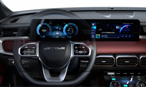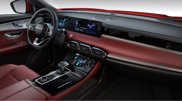 内饰部分,捷途X70 PLUS采用了全新的设计风格,豪华感、科技感扑面而来,对称式中控台布局井然有序,10.25英寸一体式双联屏显示效果细腻清晰,同时搭配全新造型的三辐式多功能方向盘和双旋钮触摸式空调控制面板,打造出一个具有未来感的智能座舱。