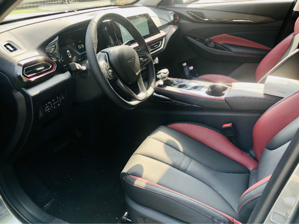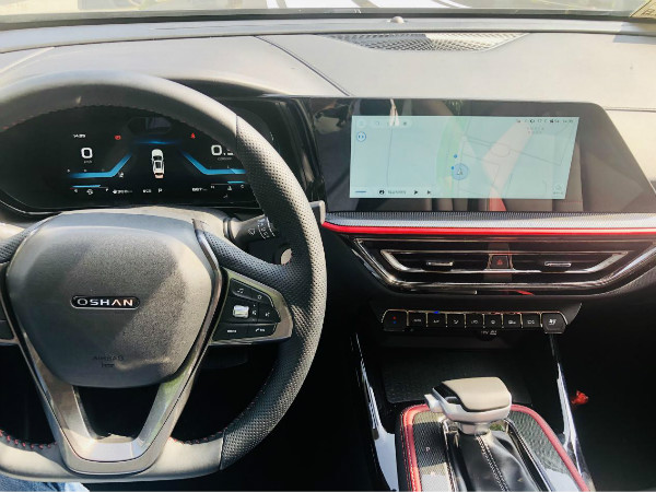 内饰方面,长安欧尚X5采用了“立体超感座舱”设计,进入车内,立体块面构建的光影层次,让笔者感到这款车的内饰整体非常协调;10英寸全液晶仪表和10.25英寸悬浮式中控液晶屏连为一体,科技感十足。中央扶手区运用了悬浮式的设计,俯看起来就像滑板形态立于之上。回形空调出风口采用了三层镀铬设计,红色内饰点缀,与中控竞速光带相呼应。两侧空调出风口采用多边形造型颇为精致,视觉和触觉都处理得恰到好处。
