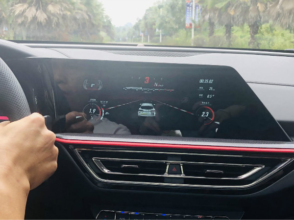 值得一提的是,切换至赛道模式后,长安欧尚X5中控屏会切换至类似赛车模拟游戏界面,开始显示方向盘的转向角度、时速、转速、油门开度、涡轮压力、海拔、坡度等信息(驾驶模式切换按钮在空调按键右侧,也可通过语音控制进行驾驶模式切换)。当你每次浅踩油门踏板时,车厢会发出模拟出大排量发动机的声浪;深踩油门踏板,除了中控屏的虚拟小车尾排能“喷火”,车厢内部会传出模拟使用氮气加速的声音效果,让用户更有驾驶乐趣。