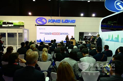 2013年10月,大金龙第5次参加BUSWORLD欧洲展,推出3款达到欧六排放标准的精品公路客车,紧跟欧洲客车市场发展步伐。展会上,大金龙海外营销总监谢卫国向法国经销商交付了第4万辆出口客车,向世界展示大金龙海外拓展取得的成就。