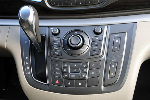 内饰沿用了家族式环绕式设计风格,仪表台简洁大气,大面积的仿桃木装饰面板提升了车内豪华的气息,也透露出它主打商用的定位。换挡形式从老款的怀档换成了手排挡,位置放在了中控台控制区,不占用下方腿部空间这点与老款相同。