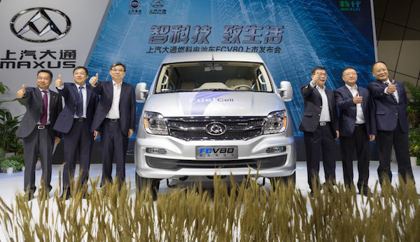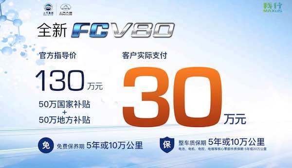 11月17日,当日本丰田汽车在2017届广州车展上宣布,其氢燃料电池车MIRAI开始在中国进行实证试验,将可行性研究的对象扩大到商用车并探讨向中国导入的时候,上汽大通在同一场合宣布,中国首款商业化运营燃料电池宽体轻客FCV80正式上市,新车采用燃料电池系统为主、动力电池为辅的双动力源,最长续驶里程可达500公里。