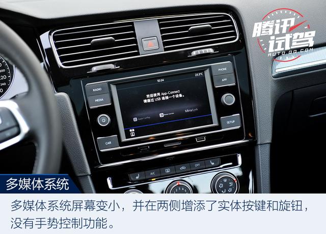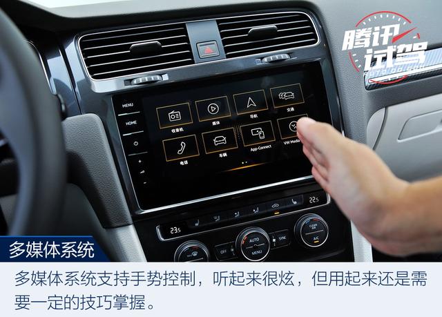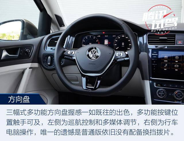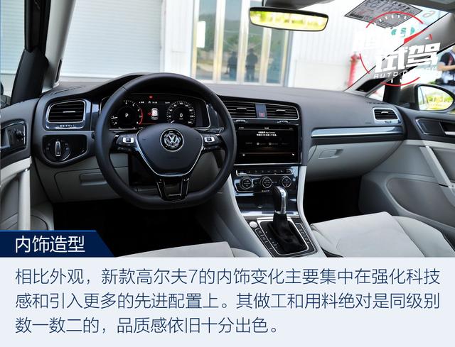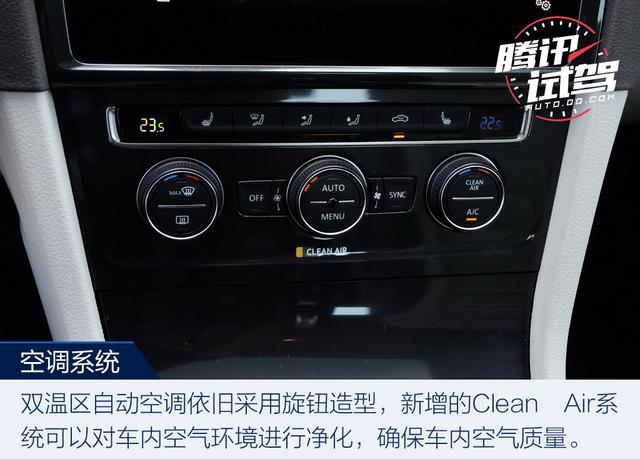 相比外观,新款高尔夫7的内饰变化主要集中在强化科技感和引入更多的先进配置上。其做工和用料绝对是同级别数一数二的,品质感依旧十分出色。三幅式多功能方向盘握感一如既往的出色,多功能按键位置触手可及,左侧为巡航控制和多媒体调节,右侧为行车电脑操作,唯一的遗憾是普通版依旧没有配备换挡拨片。12.3寸全液晶仪表的加入提升了车内的档次感,屏幕显示很细腻,可以显示七大功能,并有多种个性化信息模式设置,颇为实用。双温区自动空调依旧采用旋钮造型,新增的Clean Air系统可以对车内空气环境进行净化,确保车内空气质量。