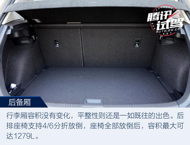 行李厢容积没有变化,平整性则还是一如既往的出色。后排座椅支持4/6分折放倒,座椅全部放倒后,容积最大可达1279L。