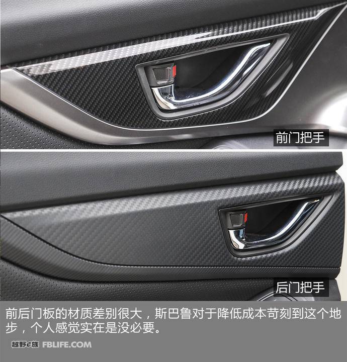对了,除了不能与前排一样一键升降窗,还有个让后排感觉受深深恶意的地方——车门把手饰板材质与前排都不一样。后排的碳纤饰板很有汽配城风格,像贴纸一样廉价。而前排的同样位置,看起来就高档得多,不失动感之余,还很有质感,与环绕的银色饰条相得益彰。