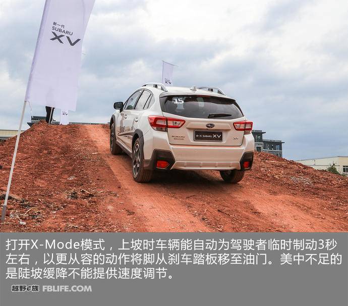 因为悬架行程不长,XV在通过坑洼路段时很容易形成交叉轴的情况,打开X-Mode系统后,行车电脑主动调节传动系统、牵引力控制、制动系统以及全时四驱系统来保持更稳定的行车动作,同时上坡时还能为驾驶者临时制动3秒左右,以更从容的动作将脚从刹车踏板移至油门。美中不足的是陡坡缓降,XV并不能提供陡坡缓降的速度调节,真正的越野驾驶时还是有一定局限性。