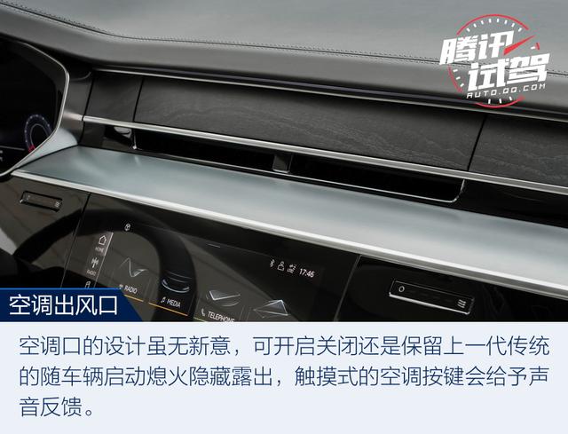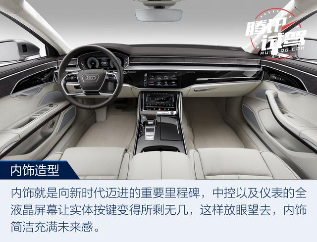 说完外观,我们来看看这次奥迪全力打造的与众不同的内饰设计。如果说新家族外观设计奠基者奥迪Q7(参配、图片、询价)的内饰只是集前面奥迪车型众长的一次新鲜尝试,那么A8的内饰就是向新时代迈进的重要里程(参配、图片、询价)碑。中控以及仪表的全液晶屏幕让实体按键变得所剩无几,这样放眼望去,内饰简洁充满未来感。仔细看材质细节,用料考究,手感舒适。空调口的设计虽无新意,可开启关闭还是保留上一代传统的随车辆启动熄火隐藏露出,触摸式的空调按键会给予声音反馈。说到具体的中控体验,除了一键启动和三两个功能按键之外,全部都采用了触摸操作,而操作全部都会显示在屏幕中,这么做无疑更加贴合如今移动生活的操作习惯。再有一点考量就是,行驶中有时无法集中观察屏幕信息,所以在你选取某个指令后屏幕会有振动反馈,响应速度被调校的非常不错。