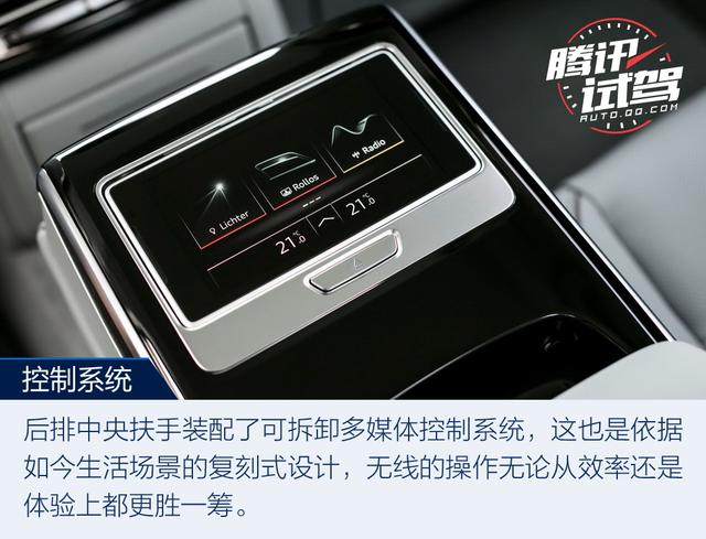 后排中央扶手装配了可拆卸多媒体控制系统,这也是依据如今生活场景的复刻式设计,无线的操作无论从效率还是体验上都更胜一筹。