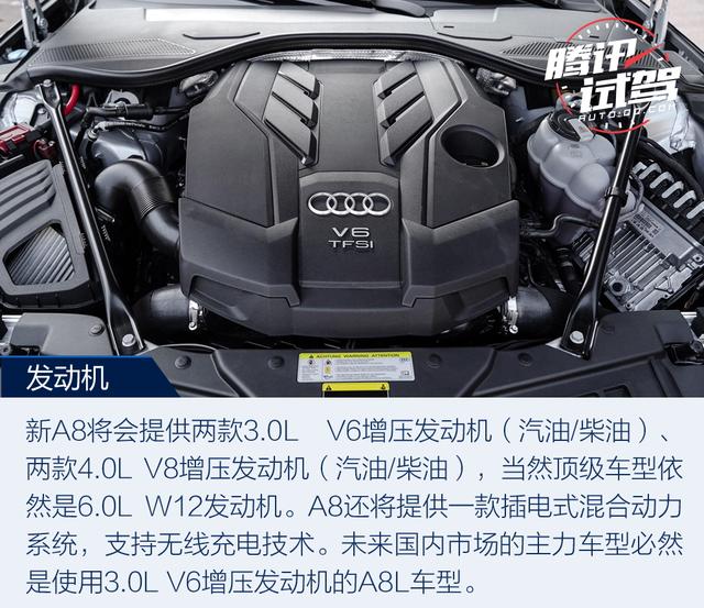 在大家都看完样子并且坐稳调整好之后,我们就可以开着这台新车出发了。新A8将会提供两款3.0L V6增压发动机(汽油/柴油)、两款4.0L V8增压发动机(汽油/柴油),当然顶级车型依然是6.0L W12发动机。除了常规的汽油和柴油动力之外,A8还将提供一款插电式混合动力系统,并且支持无线充电技术。从国内市场需求来看,未来的主力车型必然是使用3.0L V6增压发动机的A8L车型。