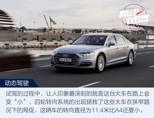 在试驾的过程中,让人印象最深刻的就是这台大车在路上会变“小”,四轮转向系统的出现拯救了这些大车在狭窄路况下的局促,这辆车的转向直径为11.4米比A4还要小。技术改变人们的生活,在狭小区域或绵延山路这些曾经与大车无缘的地方,也不必担心车辆损坏了,大可以尽情去驰骋。