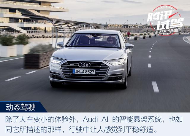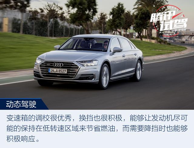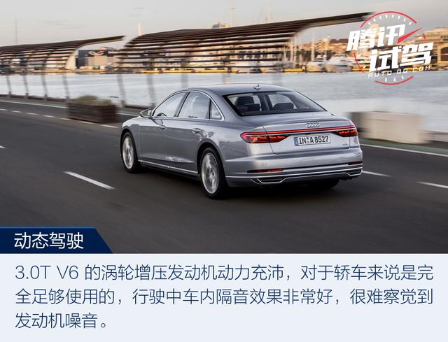 除了大车变小的体验外,之前所说的Audi AI 的智能悬架系统,也如同它所描述的那样,行驶中让人感觉到平稳舒适。常规体验方面,3.0T V6 的涡轮增压发动机动力充沛,对于轿车来说是完全足够使用的,行驶中车内隔音效果非常好,很难察觉到发动机噪音。油门的响应方面,在低速时有一定的迟滞感,高速行驶时反应非常灵敏。变速箱的调校很优秀,换挡也很积极,能够让发动机尽可能的保持在低转速区域来节省燃油,而需要降挡时也能够积极响应。
