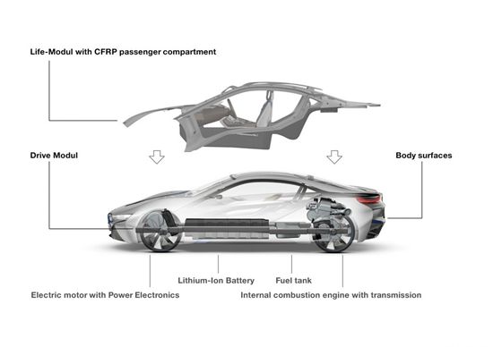i8为了控制车重采用了LifeDrive的模块化结构,底盘选用铝合金材料,车体采用碳纤维材料制造整体座舱,同时使用康宁玻璃等一系列高成本的减重材料,如果因为动力系统最后把车做成超重,那么高昂的减重成本就变成笑谈了。
