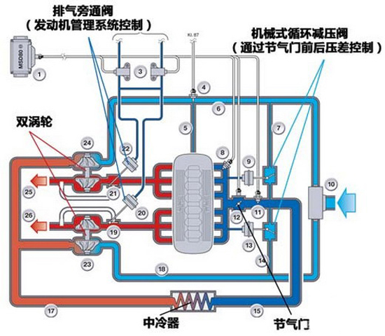 双涡轮(左)、双涡管(右)涡轮增压结构