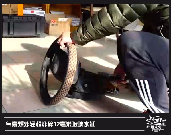 本周,他们又带来了新一轮测试,看看安全气囊在水中的威力如何。为了展示水中效果,他们专门定制了一个玻璃水缸,三围尺寸60*80*60cm,厚度达到了12mm。 同时,他们找来一个完整汽车方向盘部件,从方向盘上拆下安全气囊,放入水池中,接上电线引爆,结果玻璃水缸瞬间被击碎,水流一地,现场碎片狼藉。而且这次测试的是主驾驶位安全气囊,而副驾驶位安全气囊威力一般会更大,因此在高速上坐副驾驶位置时,头部一定要距离安全气囊40公分开外。