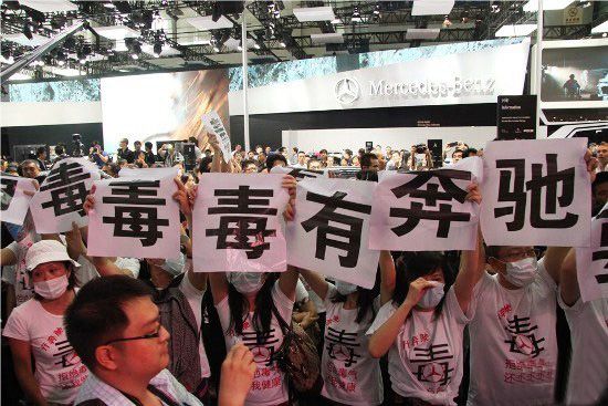 事件还原:" 奔驰有毒" 没有上到2013年3.15晚会的头条,但在3.15余威犹在的"3.19 晚会" 上,央视曝光了奔驰C 级车内异味的问题。事件并没有在3.19之后销声匿迹,在这之后深圳车主让" 奔驰毒车" 事件进一步扩散。一群深圳车主自发举办" 奔驰毒车展" ,目前已经进行到了第三届,香港甚至也已经有他们毒车展的身影。央视曝光之后,北京奔驰厂家针对反映车内有毒气的车主免费更换了脚垫(相当于一次隐性召回)。但换脚垫后发现异味消除并不明显,车主不满意,厂家似乎也没有更好的解决办法。于是进行到后面,厂家干脆就不作为了,任由车主闹去。