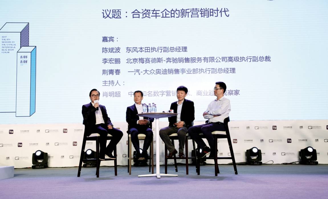 围绕这些问题,在5月8日第九届中国汽车蓝皮书论坛上,东风本田执行副总经理陈斌波,一汽-大众奥迪销售事业部执行副总经理荆青春,北京梅赛德斯-奔驰销售服务有限公司高级执行副总裁李宏鹏,展开了精彩的讨论,主持人是中国知名数字营销专家、商业趋势观察家肖明超。(点击文末“阅读原文”查看讨论现场精彩视频)