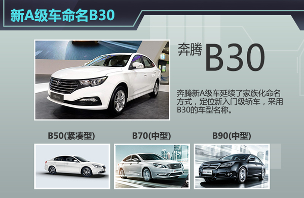 按照奔腾此前公布的产品命名规则,轿车产品将以“B”为产品系列标识,再按照系列车型的定位由小到大划分为3系、5系、7系和9系等具体的产品系列,分别以30、50、70和90等标识,“0”位代表改款次数。例如,现有奔腾紧凑型轿车命名“B50”,中型轿车产品名为“奔腾B70”,定位更高的中型轿车则为“B90”。在本届长春车展上,奔腾正式公布全新紧凑型轿车产品将采用“B30”的命名,该车将成为奔腾产品序列中的新入门级产品。