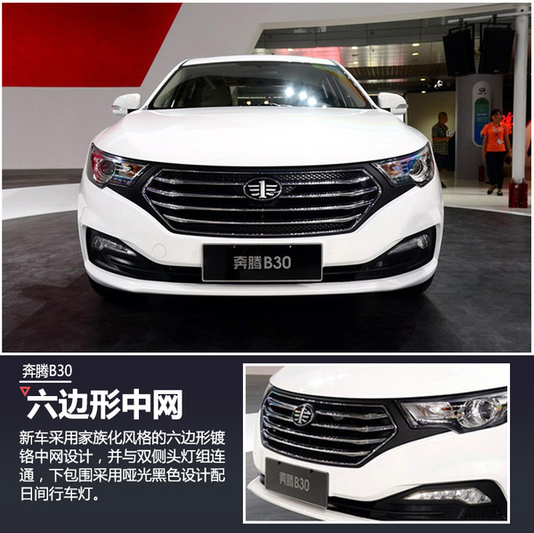 奔腾B30整体造型设计时尚大气,车身线条简洁而流畅自然。前脸采用颇具家族化风格的六边形造型,并应用4条横向镀铬饰条装饰,极具辨识度。中网与双侧头灯组连通,上格栅与双侧灯组应用一体化线条,与引擎盖自然融合,契合当下新车前脸时尚造型设计趋势。下包围应用黑色哑光装饰,两侧集成日间行车灯。