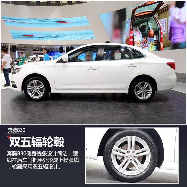 奔腾B30侧身设计同样呈现简洁化风格,腰线在后车门把手处形成上扬弧线,并延伸至尾灯处,为车侧造型设计增色不少。车门下方采用两条线条点缀,呈现一定的层次感。新车配备双五辐式铝合金轮毂,颇具动感,采用白色卡钳,与车身整体造型相呼应,视觉效果较为出色。