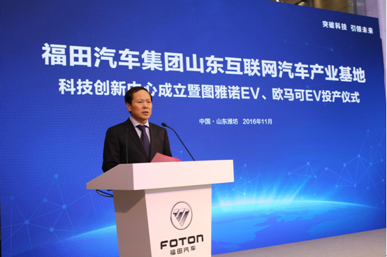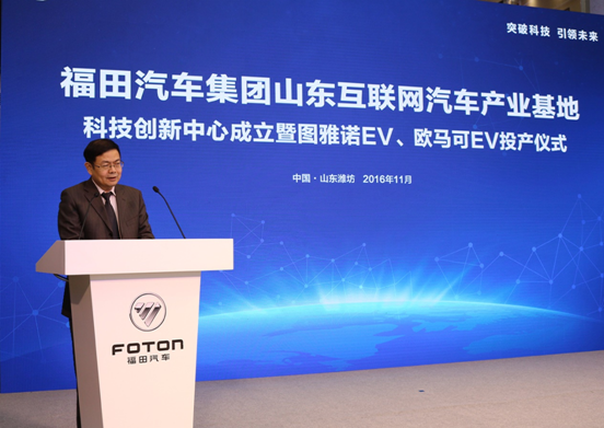 福田汽车集团党委书记、总经理王金玉先生在致辞中说道:“山东互联网汽车产业基地科技创新中心的成立,将把山东潍坊打造成集产品工程研发、制造、销售、物流、金融等综合性的区域。”