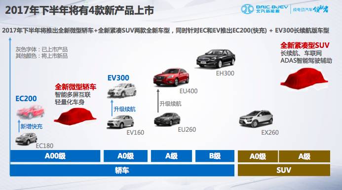 根据规划分析,下半年推出的新车将有两款升级版车型。其中,北汽新能源EC200可视为现款EC180的升级版车型,该车将在电池方面进行升级,增加其续航里程。该车计划在8月份上市。而北汽新能源EV300同样也将为现款EV160的升级版车型,将会采用容量更高的电池组使最大续航里程或达300公里。