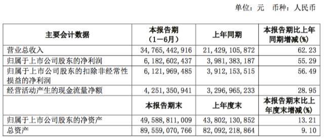 合并后,该集团今年上半年营业总收入为347.65亿元,同比增长62.23%;净利润为61.8亿元,同比上涨55.3%;每股收益为0.96元/股,增幅为54.8%。