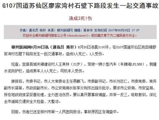 据郴州新闻网报道,事故发生于本周三(8月30日)凌晨3:00许,发生地位于(湖南)G107国道苏仙区良田镇廖家湾村石壁下路段。事故车辆“湘LFL368”(与图中车牌一致)侧撞水泥防护栏,造成乘车人3人死亡,司机本人受伤。