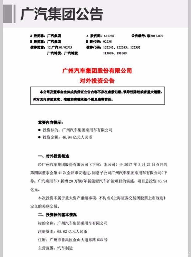 今年3月份,广汽集团发布公告称,广汽集团于2017年3月24日召开董事会,同意“子公司广州汽车集团乘用车有限公司新增20万辆/年新能源汽车扩能项目的实施,项目总投资46.94亿元”。此外,广汽集团还计划投资6亿元设立全资子公司——广汽新能源汽车有限公司(暂定名),全面开启新能源领域的加速跑。